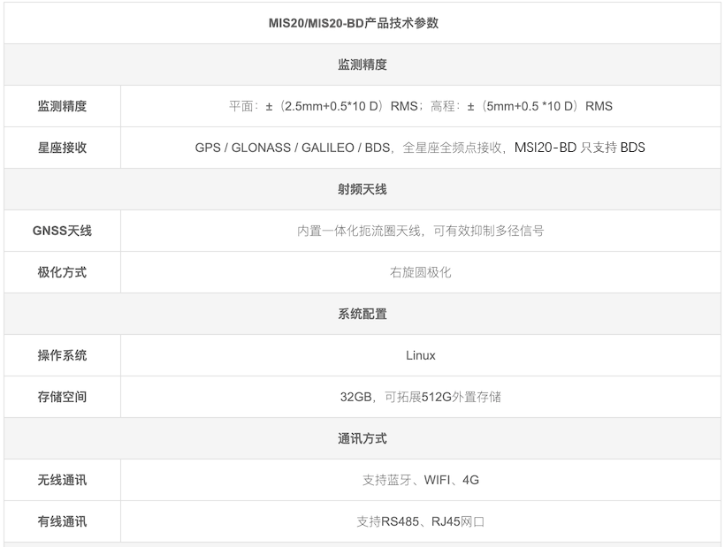 MIS20是一款普适应用于大坝、地灾、矿山、边坡等安全监测领域专用的北斗接收机,适应于GNSS高精度监测设计,采用低功耗、一体化、定时休眠、自组网、智能化的理念设计。易于部署,可全天候自动化提供高精度三维变形信息。
